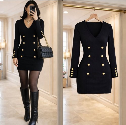 • İthal ful likralı dalgıç kumaş düğme detaylı elbise