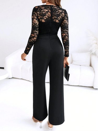 Kadın uzun kollu kruvaze yakalı dantelli önünde toka detaylı uzun ithal krep tulum
