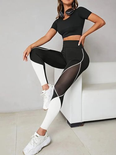 Kadın yüksek bel yanlardan tül detaylı çift renkli spor dalgıç tayt