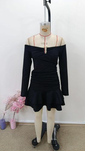 Kadın omuzlardan açık belden saran büzgülü etek ucu volanlı dalgıç mini elbise